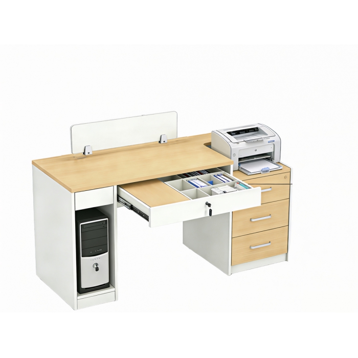 客户需求:1、主要材料:所有板件采用E0级实木颗粒板; 2、主要板材厚度:台面板厚度为25mm,侧板、背板、抽面、底板厚度为16mm; 3、功能配置:主台(单人位)+主机柜+打印机柜+抽屉+吊木挡板+Φ60mm金属线盒+钢制桌上挡板; 4、五金配置:三节路轨、锁具、拉手、连接件等; 5、封边:采用见光面为2.0mm厚全自动封边工艺,防水、防潮、不变色; 6、功能:现金纸币、打印纸、收费单据分类存放。