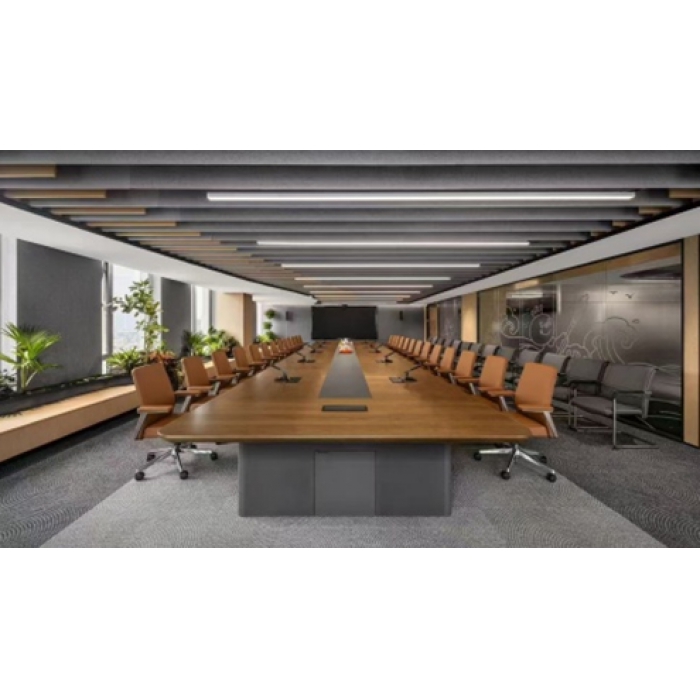1423996,尺寸:4800W*1600D*750H,材质:1.基材:采用优质中密度纤维板2.饰面:采用优质天然木皮,厚度≥0.6mm3.油漆:采用环保油漆,颜色:桌面pt-23风影胡桃,桌架铁灰色