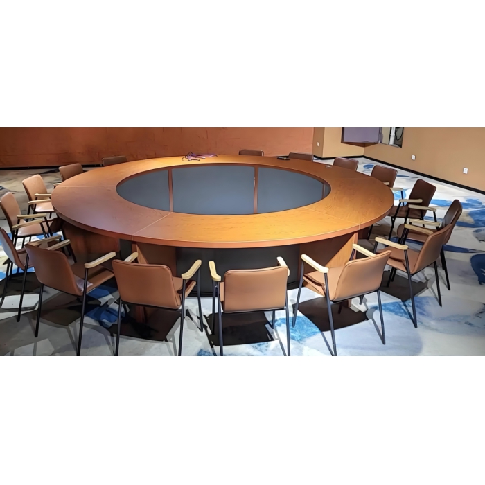 客户需求:1.整体尺寸(mm):直径2000,高760(允许偏差范围:±10mm)。 2.基材采用中密度纤维板,要求。表面采用进口0.8mm厚水曲柳木皮热压贴面。表面油漆涂装处理 3.电源管理:配置多功能静音翻转线盒,走线隐蔽,安全合理,配置13个电源及网线转换模块。