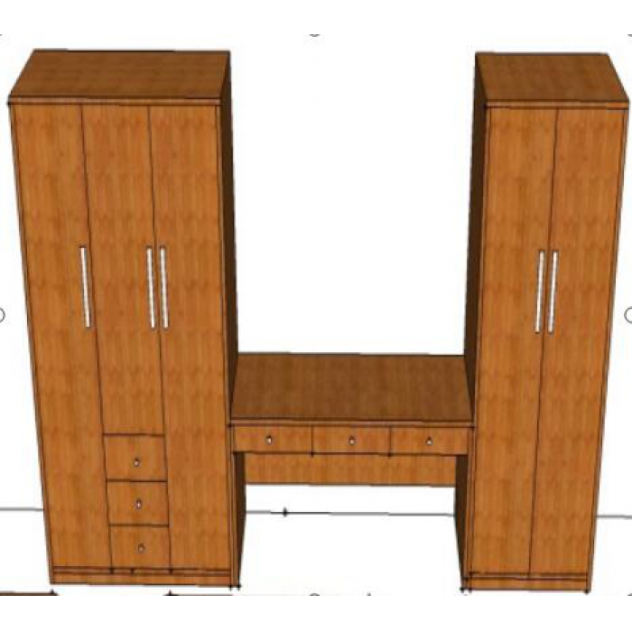 客户需求:尺寸:三门:1200*500*2000,书桌:1500*500*750,两门:800*500*2000,三门衣柜中间门柜下方带三抽屉,中间电视书桌为三抽屉,根据柜子高度合理布局工型拉手。