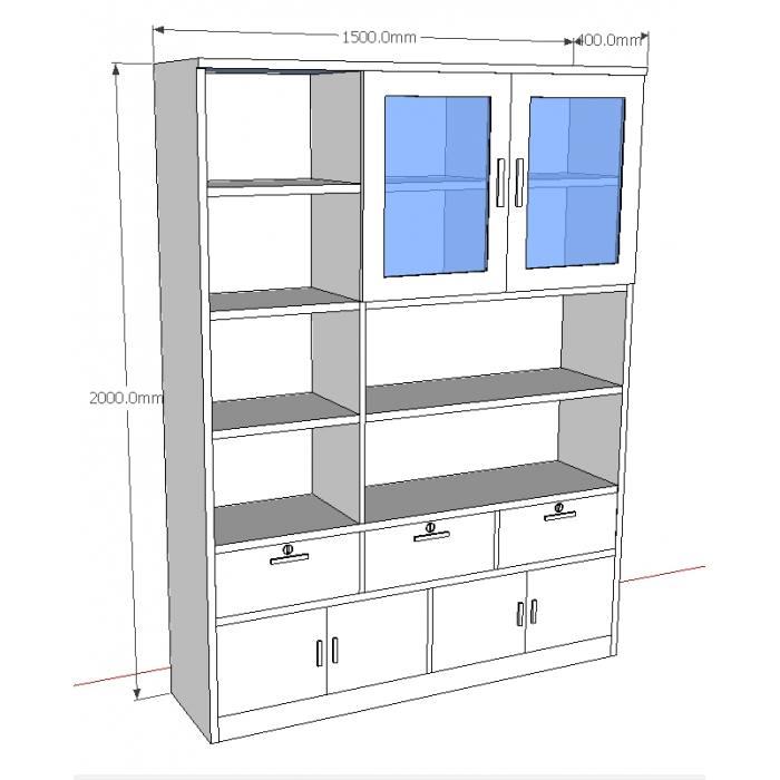 客户需求:1、用18mm厚度板,2、柜体上部右侧为玻璃门,3、抽屉单独锁。4、长隔板要有加强筋。