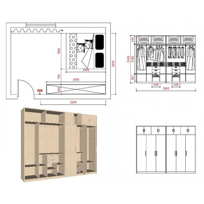 客户需求:1、材料厚度18mm,2、带四根挂衣杆。3、抽屉带独立锁。4、要求结实耐用。
