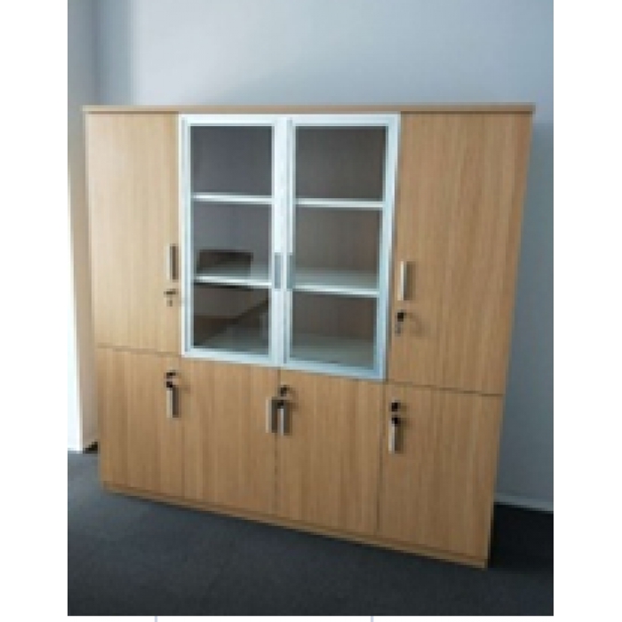 2112466,尺寸:1800*540*1800,材质:E1级三氢板,固定层板与活动层板为白色三氢板,其余颜色:黄橡 ;右侧为一个大门,内置挂衣杆,1块活动层板,左上门内2块活动层板,下面中间两个门内放置折叠床,上中门为2个铝合金门;所有门均配锁。,颜色:黄橡/白色