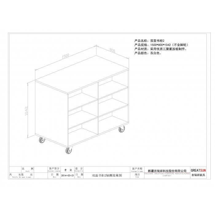客户需求:材质要求优质三聚氰胺板,顶,底,侧板用25mm厚料,其余用16mm厚的料。上面放书考虑配件连接牢固,下面轮子采用质量好的,要能承受柜子放上书的重量。高度1100是含轮子的高度,见图纸