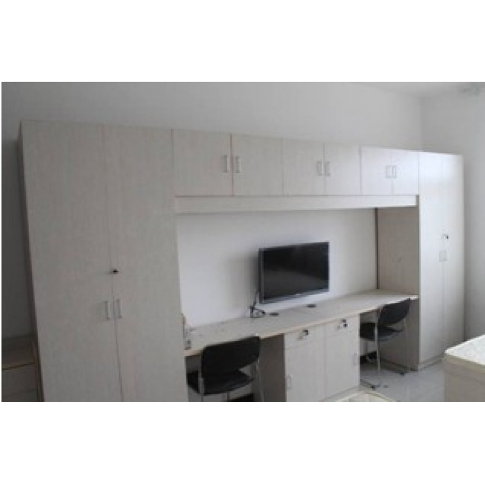 客户需求:材质说明:优质绿色,具有防刮花,耐高温,防水性能好,耐磨,无异味特点, 面材:桌面25mm厚,其余16mm优质E1级中密度500-700/KG刨花板,耐磨、耐高温、易清洁.(不固定在墙体)