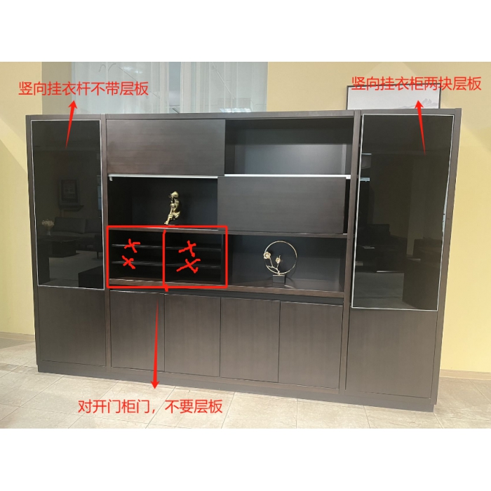 客户需求:整个框架做成25mm的板子,两边衣柜都带竖向挂衣杆,右边衣柜带两块层板,左面衣柜不带层板,中间两个格挡改成小柜门不要层板