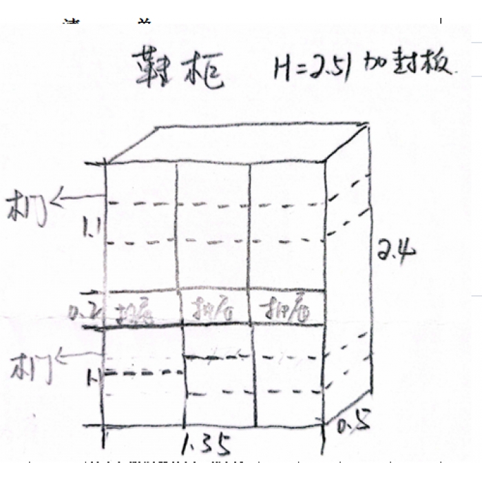 客户需求:上面一排柜门每个柜门里带两块隔板,中间抽屉,下面第一个柜门里带一块隔板,其它两个柜门里带两块隔板,不带拉手,斜侧边开门。