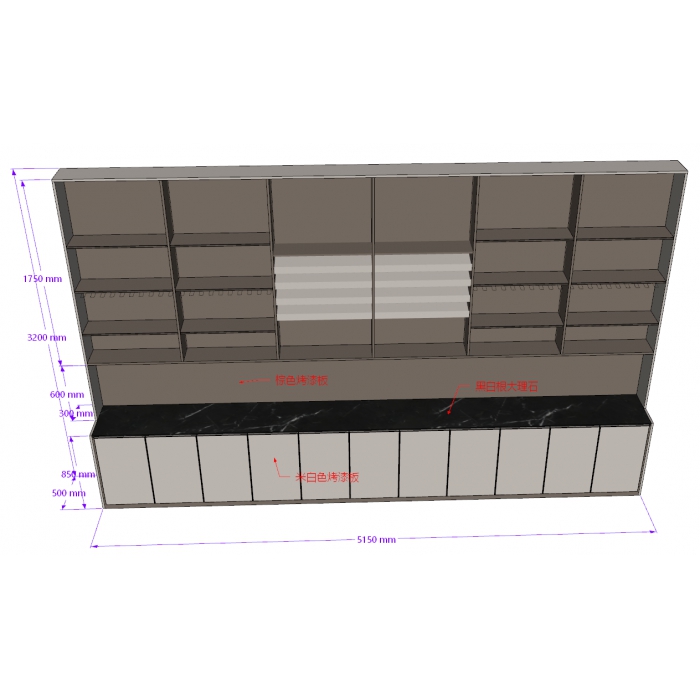 2199528,尺寸:5250*500*2950,材质:烤漆,颜色:棕色+黑白大理石