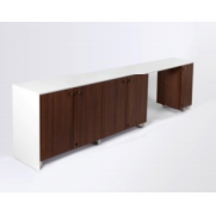 2199793,尺寸:2700×400×750,材质:质:浅胡桃木中纤板贴木皮喷漆,外框 白色喷漆,高光 #拉丝不锈钢扁钢脚。,颜色:白色+黑胡桃木
