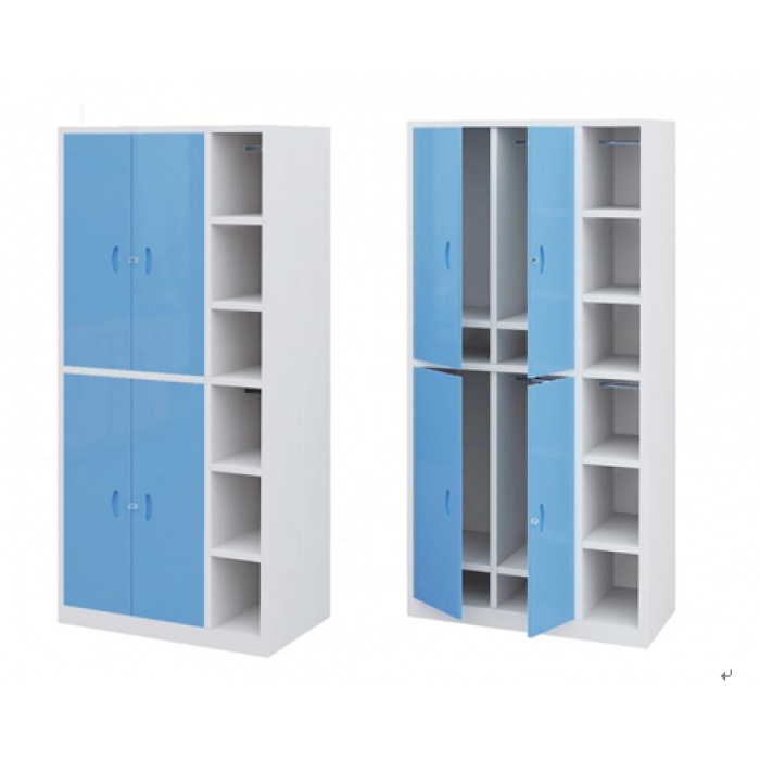 2211681,尺寸:1000*600*2100,材质:柜体:0.7mm厚冷轧钢板制作,背板采用2片拼接工艺处理,增加后背强度;行李柜分两层,左侧柜内净宽350mm,中间柜内净宽300mm,右侧镂空柜内净宽240mm,层板为0.6mm冷轧钢板制作,活动隔板可调;左侧柜内可放置皮箱,最大规格为:470*780*280mm;中间为衣柜,柜内带不锈钢挂衣杆一根;右侧带不锈钢毛巾杆,带活动隔板两块高度可调,中层可放置洗漱用品;,颜色:浅灰套浅天蓝