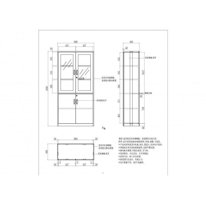 客户需求:电信年度采购项目产品 1.钢板:一级电解钢板(冷轧钢板,电解处理),钢板厚度1.0mm。表面处理采用静电粉沫喷涂工艺处理。 2.喷塑:柜体环氧树脂静电粉沫喷塑,所用塑粉沫需通过ISO14001质量体系认证,浸泡式磷化处理。耐磨、防锈、防静电。 3.颜色:浅灰,涂层厚度≥70um。 4.结构:门内上下各设两层可调隔板,门上带标签框、锁,柜体底部安装可调平脚。 5.锁具:采用品牌锁具。