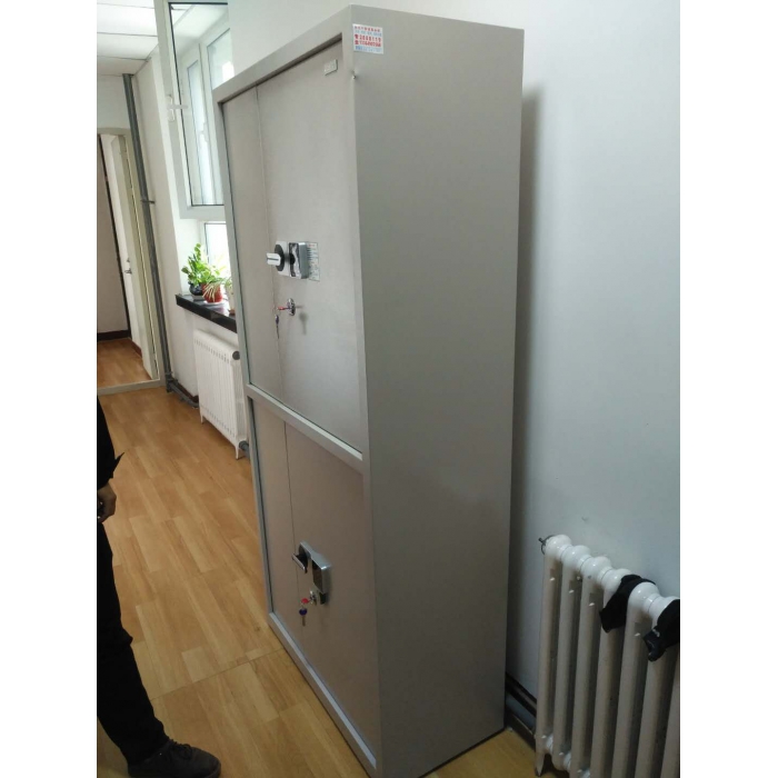 客户需求:0.8冷板制作,上下柜内各带两块活动隔板,上下柜各装两把锁,密码锁为国宝密码锁