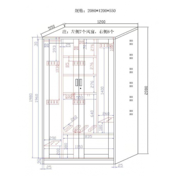 2211868,尺寸:1200*550*2080,材质:柜体、柜门采用1.0mm冷板,后背板采用0.6mm冷板加筋,柜体内带220伏电源及漏电保护装置,内带5个20孔排插。,颜色:浅灰