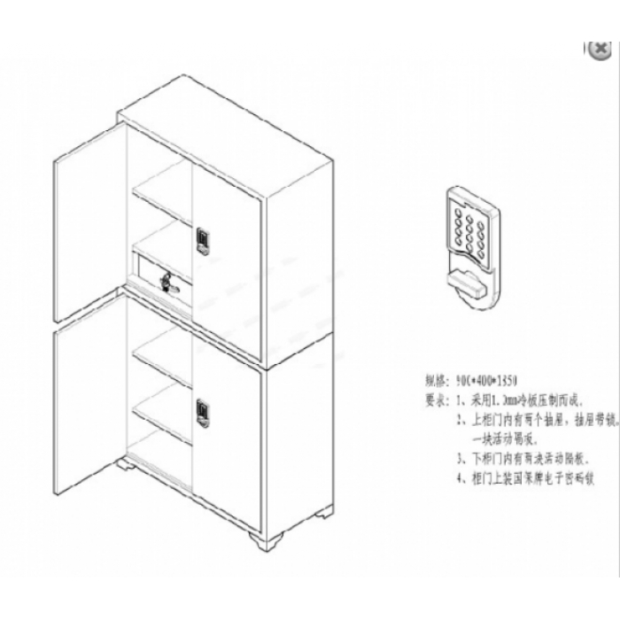 客户需求:1.采用0.8mm冷板 2.上柜内有两个抽屉、配置1块活动隔板 3.下柜内配置两块活动隔板 4、柜门安装国宝电子密码锁