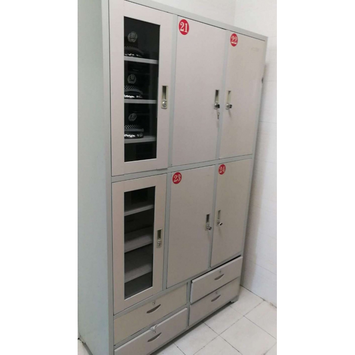 客户需求:左门带玻璃,每门内含活隔板3块。其余四门内各含挂衣杆一个。整柜设抽屉四个。