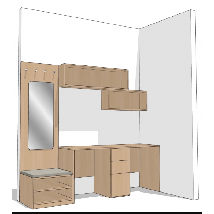 客户需求:1:每套含6个挂衣钩 2:鞋凳面咖色布绒软包 3:抽屉阻尼静音导轨 4:镜子用镜钉固定 5:写字桌面开2个穿线孔含铝合金穿线盒 6:鞋凳、写字桌两侧板及凳面、桌面用25mm厚高拉橡木三氢板,其余用16mm