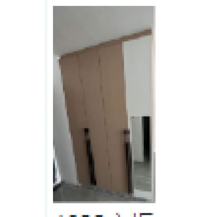 4.结构:顶板、底板采用25mm优质三聚氰胺板制作,侧板、门板、隔板采用18mm优质三聚氰胺板制作,柜内挂衣杆采用φ19*1.0mm优质304#不锈钢制作,单独柜门外装1450*300*5mm穿衣镜一块,使用内嵌工艺,与柜门成平面,四周铣宽5mm深3mm线条,油漆封边,外形美观,顶部封板根据现场实际情况安装,天花板与封板采用密封胶收口处理;