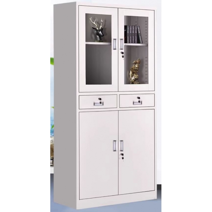 2.柜门:上玻璃双门,中间双抽屉带锁,下钢质双门制作工艺同柜体,双层门板设计,用1.0mm冷轧钢板经激光冲切、折弯成型。所有工件外露部分用满缝焊接经打磨抛光处理,表面光滑不刮手。门面板采用双层结构内外部都经过环氧树脂喷涂中间填充隔音材料。门板配置门扣组及橡胶缓冲装置。层板采用1.0mm冷轧钢板经激光剪裁、定位打孔、后折弯焊接后成型,层板底部带加强筋,增强层板承重力,层板活动可调,所有钢材均采用国家标准钢材,各钢件经除锈、酸洗、磷化等工序;