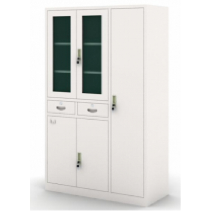 2.结构:上门共二块活动隔板,可上下调节,上门采用4mm玻璃,中间为两抽斗,下门为钢制柜门,内凹扣手,明锁扣;衣柜内带不锈钢挂衣杆及两块活动隔板;