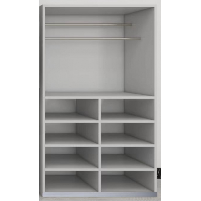 客户需求:1、柜体:采用国标 0.7mm 厚优质冷轧钢板。 2、结构:镂空柜体,上部带不锈钢毛巾杆,共 4 层隔板,中间带 一块竖隔板,底部为不锈钢裙边腿。