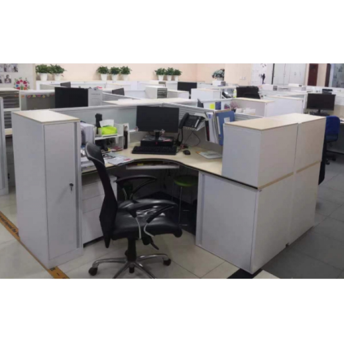 客户需求:备注:A4型材,桌面采用白橡木(尺寸:1300*1600*25),屏风结构桌面以上米色布绒装饰板,装饰板上一侧为磨砂玻璃一侧为挂槽板,屏风桌面以下为光面白色凸点钢板,带3个模块孔位在底部链接地面处,带机箱托,带键盘托。