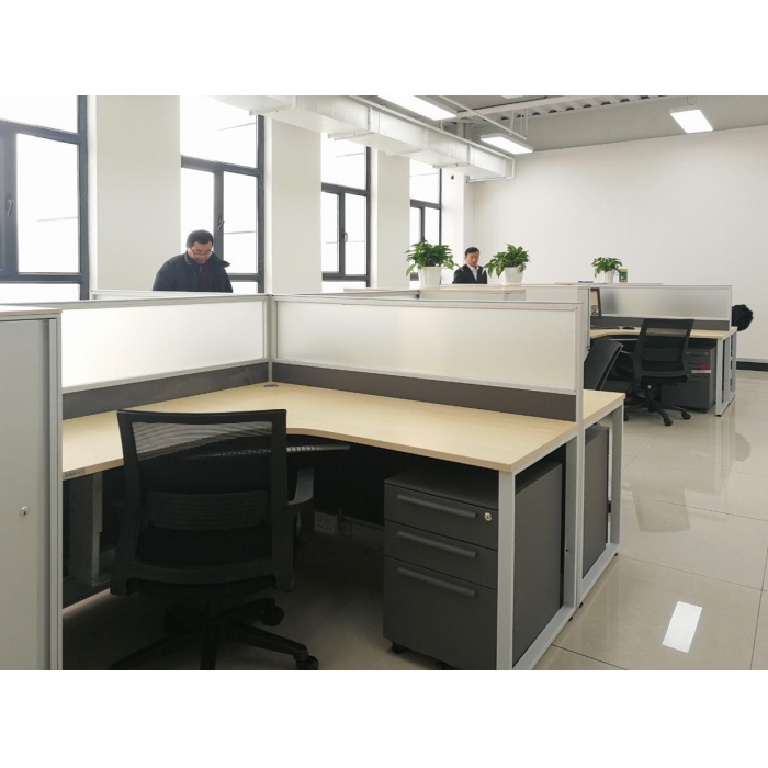 客户需求:备注:T字形2人屏风工位,A40铝合金框架桌面以下麻面铁灰G24+中间铁灰色钢板+上磨砂玻璃+屏风侧腿钢架暖白+桌面与衣柜顶盖、机箱架白枫,带钢制衣柜暖白+钢制活动柜铁灰,+机箱架+PVC键盘。3440*1540*1200高,1540包括钢制衣柜尺寸。钢制衣柜柜顶木板和桌面颜色一样。5个房间T字形的两人位两人位摆放