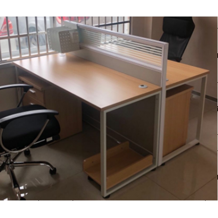 客户需求:(两个桌子中间是T3框架屏风,银拉丝+条状磨砂玻璃,桌下不带走线)含活动柜,机箱架,书架浅灰色,笔盒浅灰色)