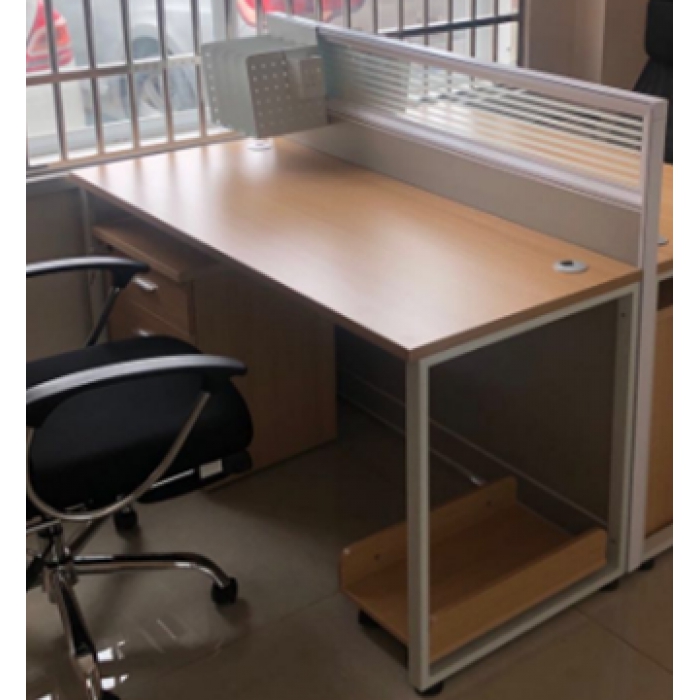 客户需求:(桌子前面是T3框架屏风,银拉丝+条状磨砂玻璃,桌下不带走线)含活动柜,机箱架,书架浅灰色,笔盒浅灰色)
