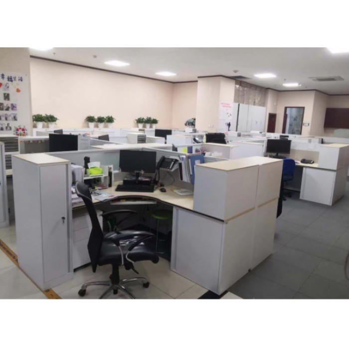 客户需求:客户需求:采用A4款屏风,整体结构尺寸为1800*1800*1200;正前方屏风尺寸1800结构为桌面上为装饰板包米色布绒,装饰板上为磨砂玻璃,桌面以下为凸点钢板;右侧屏风尺寸1800结构为桌面以上包米色布绒装饰板,装饰板上为挂槽板,桌面以下为走线槽及凸点钢板;模块为4个三孔插座+2个弱电(1网线1电话线);衣柜顶板为白橡木三聚氰胺板,尺寸:300*600*1200;桌上文件柜顶板为白橡木三聚氰胺板,尺寸:600*350*450;床柜顶板白橡木三聚氰胺板,尺寸:630*595*725;配与床柜配套的折叠床;桌板为白橡木尺寸为1500*1800*25;工位配笔筒、资料架、电话架、标识牌各1个