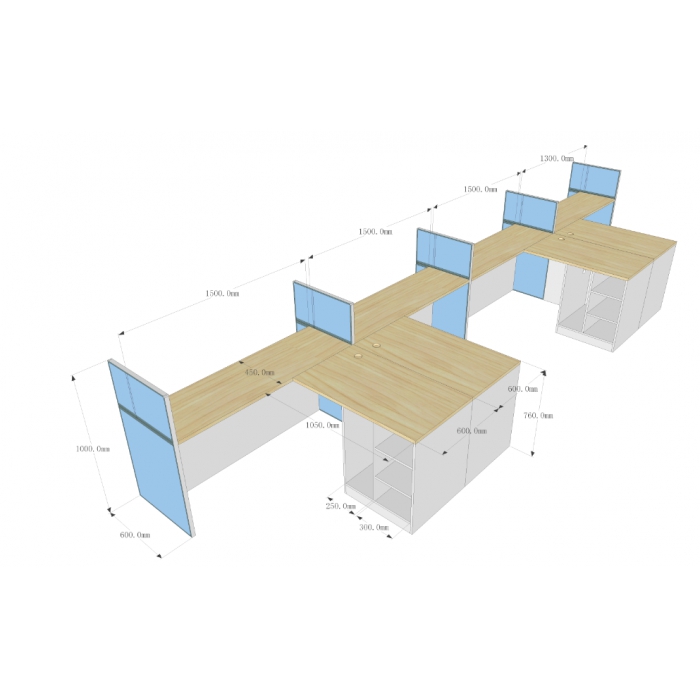 2412547,尺寸:5960*600*760,材质:320屏风框架+三氰板桌面,+键盘,颜色:屏风框架桌面以下和桌面以上蓝色三氰板+饰面白枫桌面+白枫副柜+带键盘
