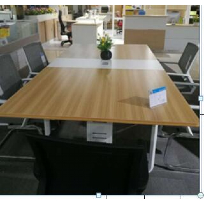 2412639,尺寸:2400W*1200D*750H,材质:E1级中密度MFC三聚氰胺板+钢制,颜色:同展厅会议桌颜色(1412863)+暖白