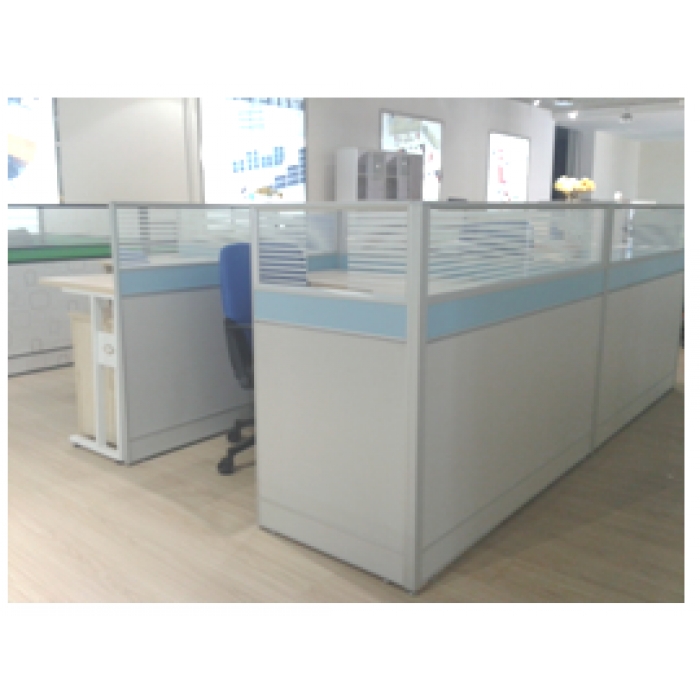 客户需求:条砂玻璃+淡蓝色屏风板,带线槽;每人位含挂桌、活动柜、机箱架、PVC键盘各一个。