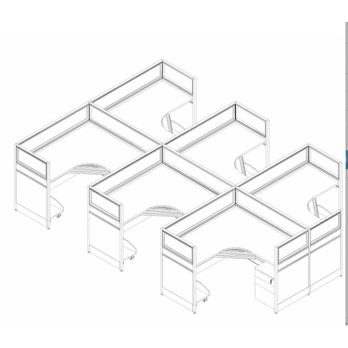 客户需求:1,屏风高度:H=1200 2,屏风布局:线槽板+三聚氰胺板+三聚氰胺板+玻璃 3,挂板桌尺寸:1500*600*1500*600 4,配置:活动柜;PVC键盘;主机架