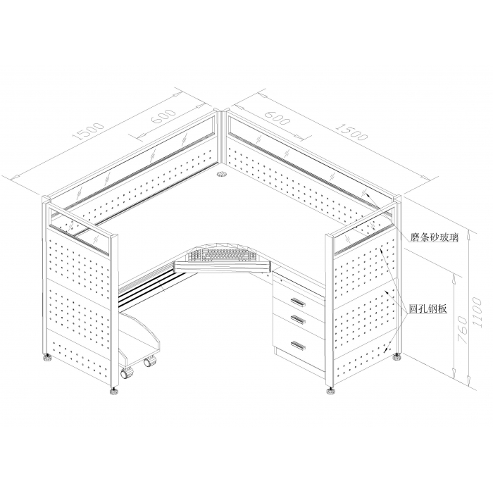 2412899,尺寸:1500*1500*1100,材质:铝型材框架,圆孔钢板饰面,三聚氰胺板桌面,颜色:钢板:浅灰/桌面:白橡木色