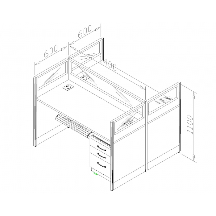 2412912,尺寸:1464*1232*1100,材质:320屏风铝合金型材,桌面以上200mm高条纹磨砂玻璃,间隔20mm磨砂,其余为三聚氰胺板,挂桌和活动柜三聚氰胺板著作,颜色:挂桌、活动柜为白橡木色三聚氰胺板,屏风饰面采用淡蓝色三聚氰胺板