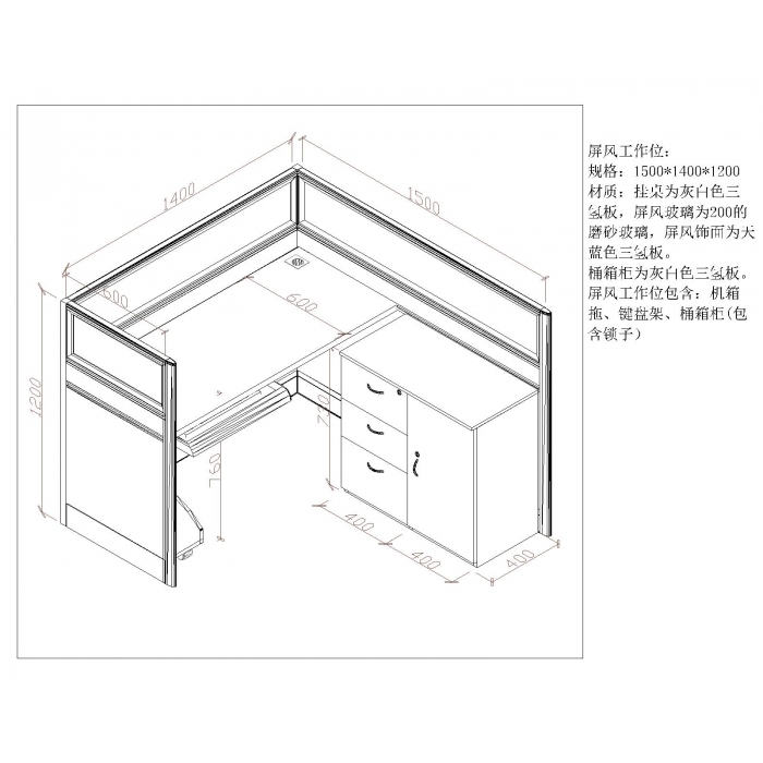2412918,尺寸:1500*1400*1200,材质:挂桌为三聚氰胺板,屏风为20mm磨砂玻璃,饰面(天蓝色),颜色:灰白色