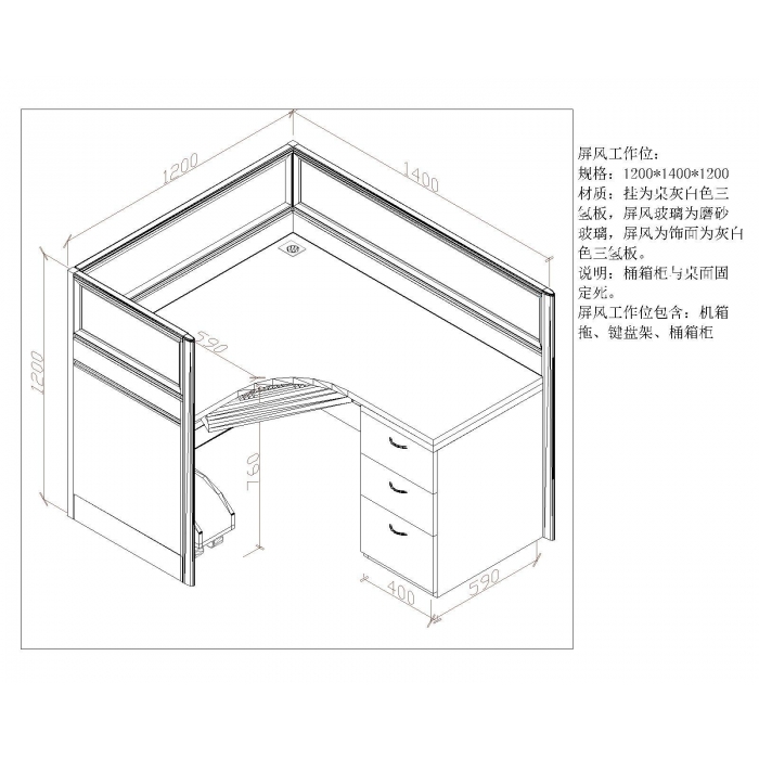 2412920,尺寸:1400*1200*1200,材质:铝合金型材框架,挂桌为三聚氰胺板灰白色,屏风饰面用防火板天蓝色,颜色:天蓝色