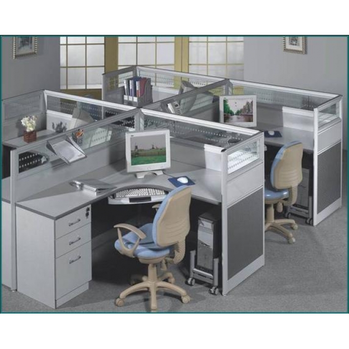 配置:屏风、挂桌、机箱架、键盘屏风结构如图所示,桶箱柜与桌面连接屏风:H=1200 铝合金型材,上条200mm条砂玻璃,下部为灰白色三聚氰胺板挂桌:1200*1400 灰白色三聚氰胺板键盘:pvc键盘