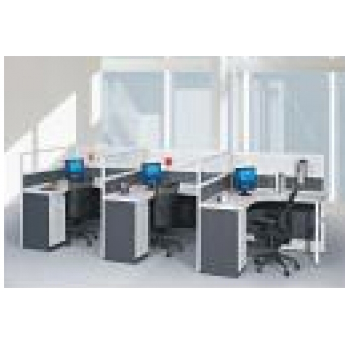2412977,尺寸:1500*1500*1200,材质:屏风:铝型材框,三聚氰胺板饰面;三聚氰胺板桌面及活动柜、机箱架,PVC键盘架,颜色:屏风及桶箱侧板:银拉丝板;桌面:灰白色