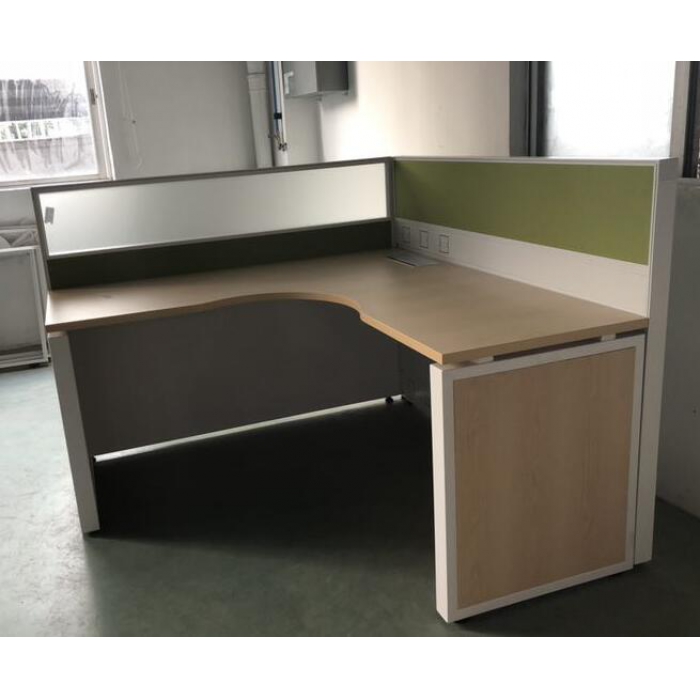 2415977,尺寸:1200*1400*1150,材质:1.底端0.6MM宝钢一级冷轧钢镀锌钢制凸点面板、中端钢制贴丹麦进口盖布瑞布面板,上端搭配5MM厚双面玉砂钢化玻璃,进口粉喷涂料,无磷环保静电粉喷涂装;2.钢板厚度>0.6MM,屏风厚度达到40MM;3.桌板为25MM厚度防火板贴同色2MM厚PVC封边;4.具备屏风内部走线功能,强弱电分离,配同色钢制活动柜。5、双走线功能。,颜色:白色屏风,白枫色桌面。