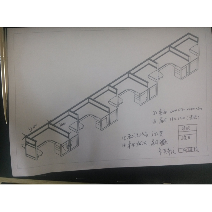 客户需求:1,桌面尺寸;1200*500*1400*600 2,屏风高度H=1100(1200的屏风带线槽板;其他不带线槽板;屏风布局线槽板+三聚氰胺板+三聚氰胺板+清波) 3,配活动柜;主机架