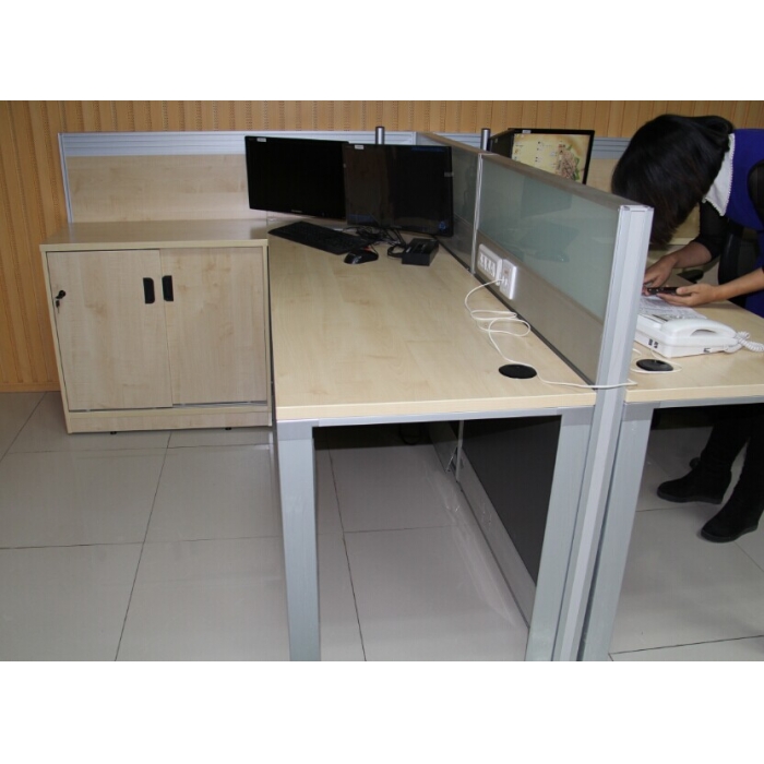 客户需求:说明: 1、规格:(桌面)1500*600*760 (副柜)800*400*760 2、材质及颜色参照所附实物照片。 3、中间T8屏风桌面上部为双面玻璃饰面,并带走线槽,底部桌面以上走线槽。
