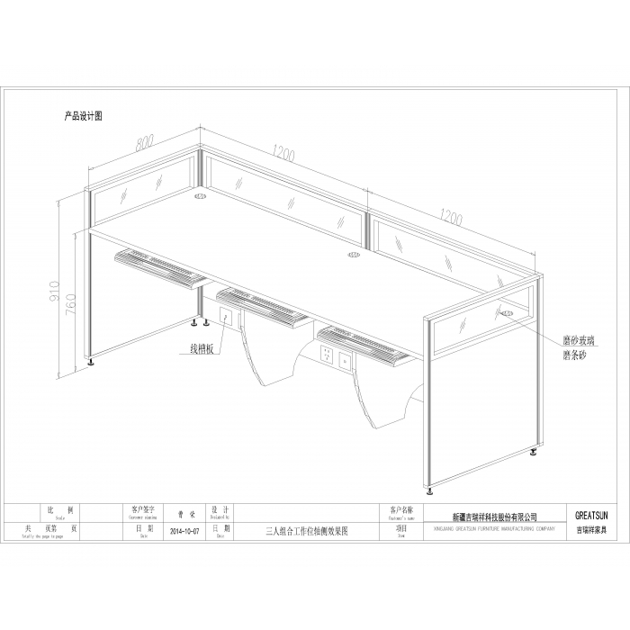 客户需求:屏风玻璃全磨砂;桌面下加2个G28侧腿加固,均分桌下形成三个工作位,带键盘;侧腿与桌面连接面不小于60cm;三组穿线孔及桌下线槽板上---电源插座、网线插座分布于三个工作各位正中。请评审价格和供货期。谢谢!