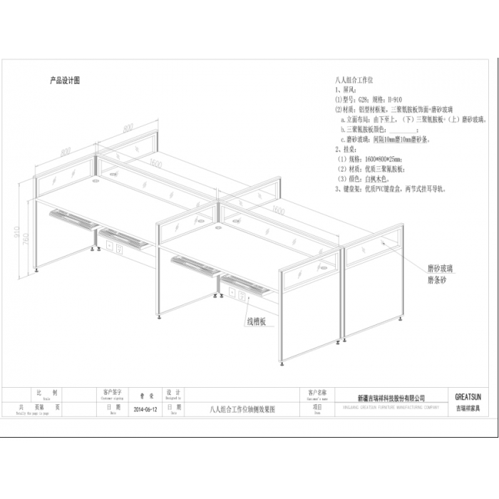 客户需求:1、配置:屏风+桌面+PVC键盘架。 2、屏风框架采用28mm厚度的铝合金屏风组架,壁厚2.0mm。 3、屏风饰面采用三胺板 与4mm磨砂玻璃组合饰面。评审价格 4、桌面采用25mm厚三聚氰胺板,周边采用2mm同色PVC封边条封边。评审价格。