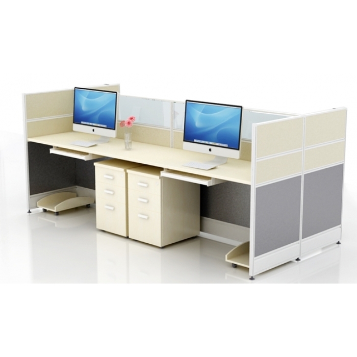 客户需求:1、1200mm屏风要求:上250mm的条砂玻璃,中间为100mm的LB-14白枫色三聚氰胺板,其余为LB-10银拉丝色,下走线,双面错开三开孔; 2、600mm屏风要求:桌面以上分两节,均为LB-14白枫色,桌面以下为LB-10银拉丝色;无线槽; 3、桌面颜色为LB-14白枫色,双开孔(靠近屏风); 4、常规三斗木抽(带锁及一字拉手),固定在桌面; 5、键盘为灰白色K2键盘,双侧边弧形木质机箱架(LB-14白枫色)。
