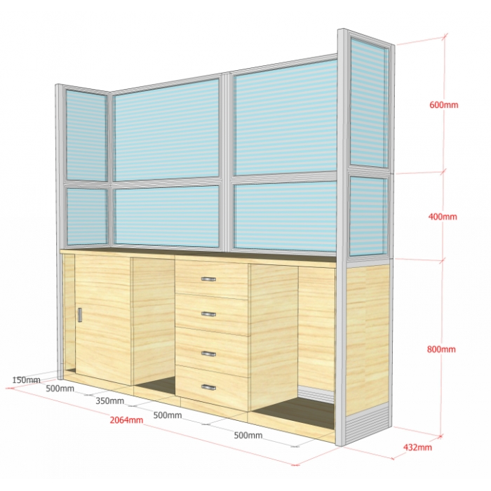 2499862,尺寸:2064*432*1800,材质:铝型材+三聚氰胺板,颜色:桌面以下白枫色三聚氰胺板,桌面以上条玻