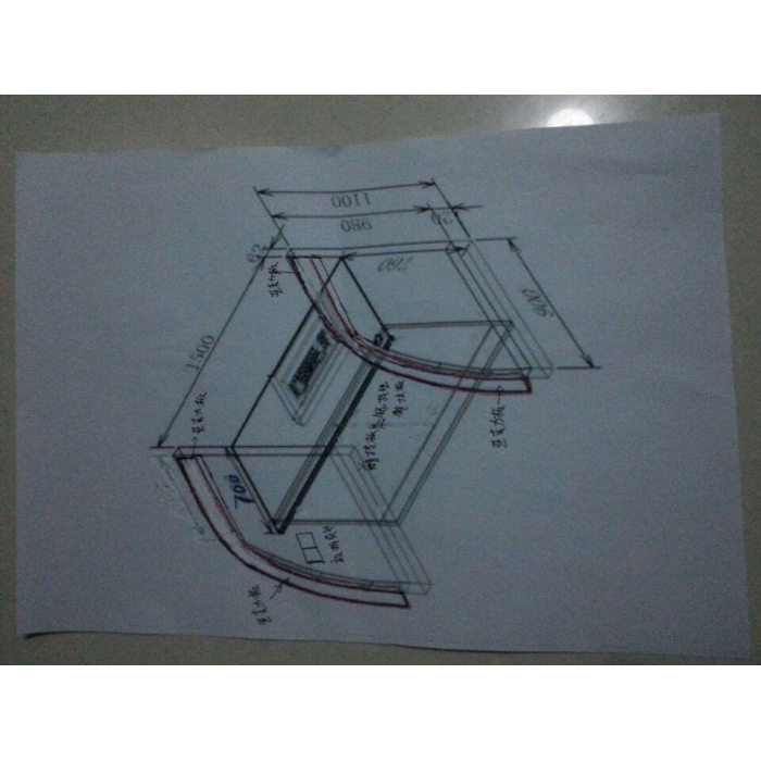 客户需求:评审时带副台,键盘架。客户机箱尽尺寸长200*高370.打印机尽尺寸400*390*320.3张桌子最两侧是原木色BS-28.中间全部是银拉丝BS15颜色。侧板带放折页纸的地方,台面是米色人造石,拉丝不锈钢底座。