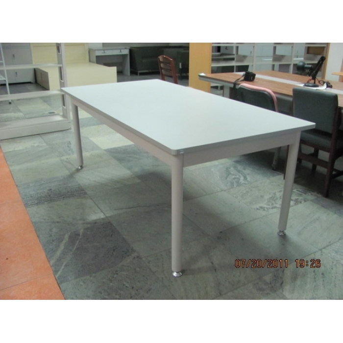 1.桌面倒圆角,灰白色三聚氰胺板,桌架圆管、冷板制作。(昌吉展厅有样品) 颜色:2.桌面灰白色,桌架浅灰色