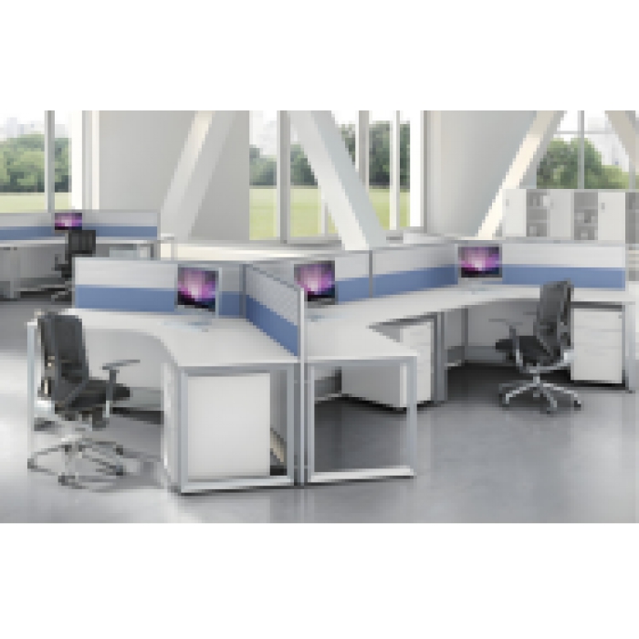 客户需求:59.整体尺寸(mm):W2351*D2713*H1150(允许偏差范围:±5mm),桌面采用25mm±2mm厚多层均质环保三聚氰胺板,三人位。 60.屏风:采用厚屏加薄屏的组合方式,厚屏≥45mm,薄屏≥20mm,屏风框架采用铝合金型材,壁厚≥1.5mm,屏风分两格,由上至下采用磨砂玻璃+三聚氰胺板结构。桌面上、下预留走线槽,可实现强弱电分离走线。 61.三人位。