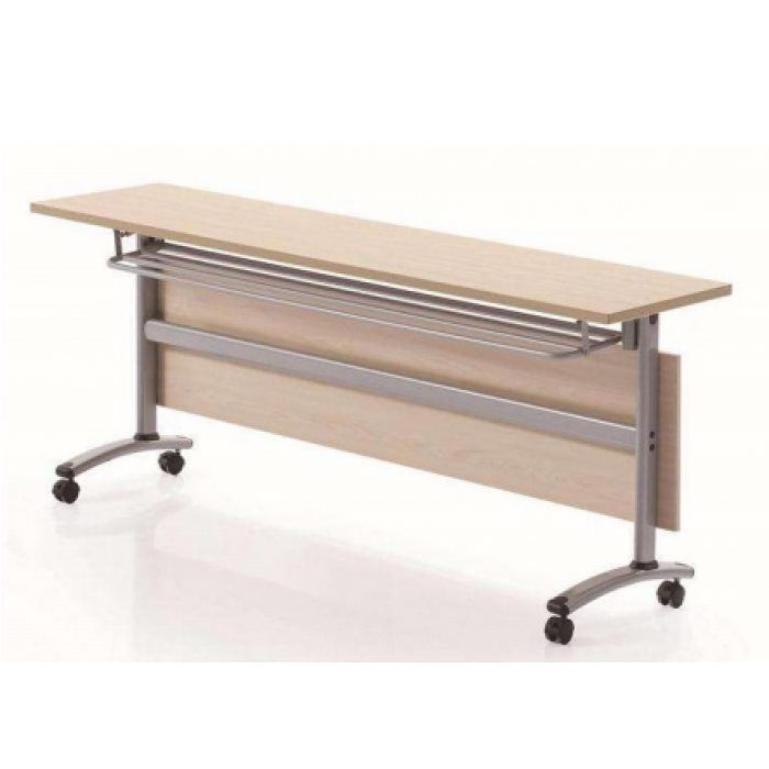 2512708,尺寸:1200*500*750,材质:桌面E1级三氢板,可折 叠;配灰色烤漆脚架 ,带脚轮,可锁定;带前挡板,当桌子并排放置时,可连接在一起 。,颜色:白枫